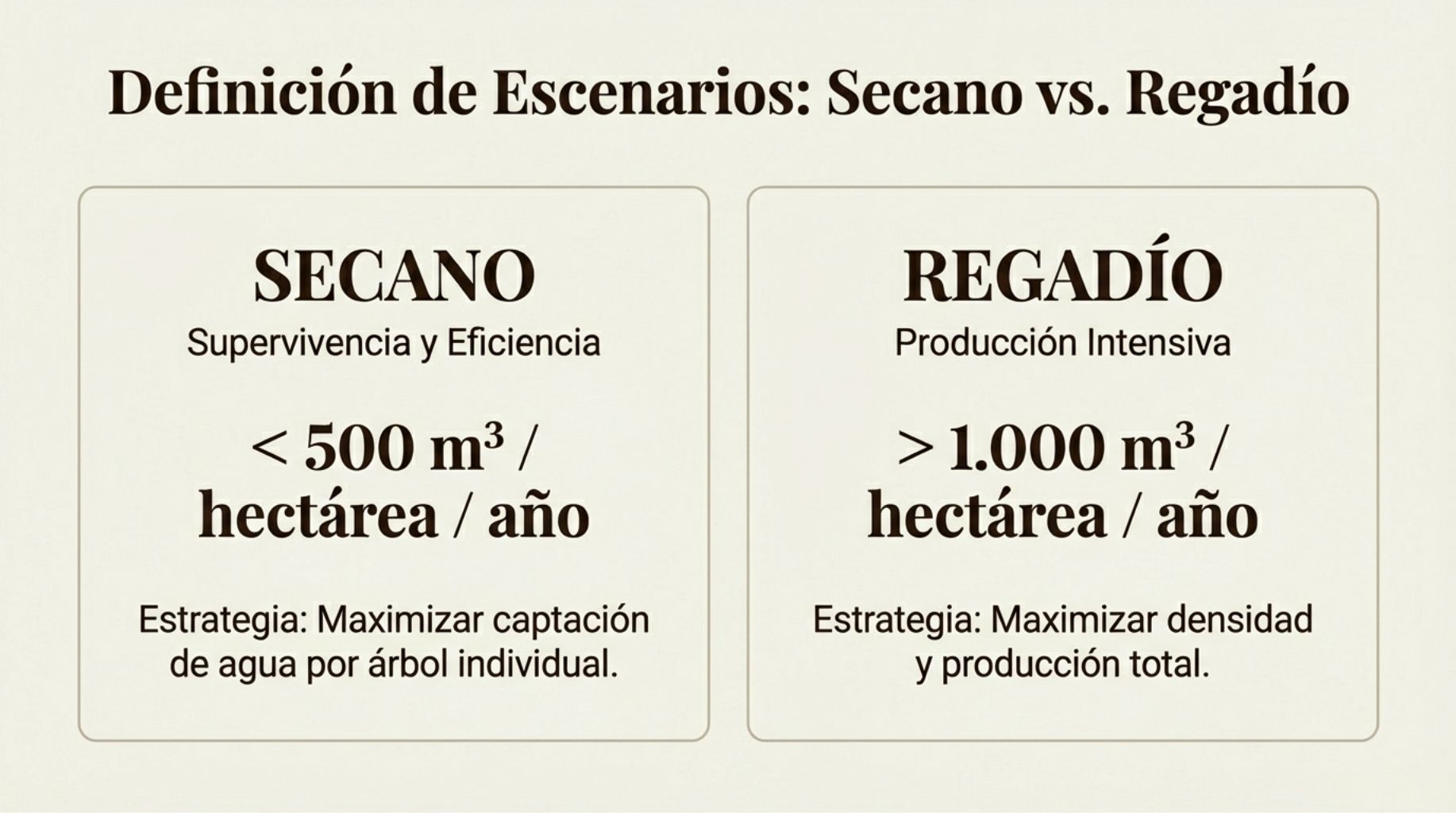 • < 500 m³/hectárea: Secano extremo. Marco amplio (8×8 o mayor)