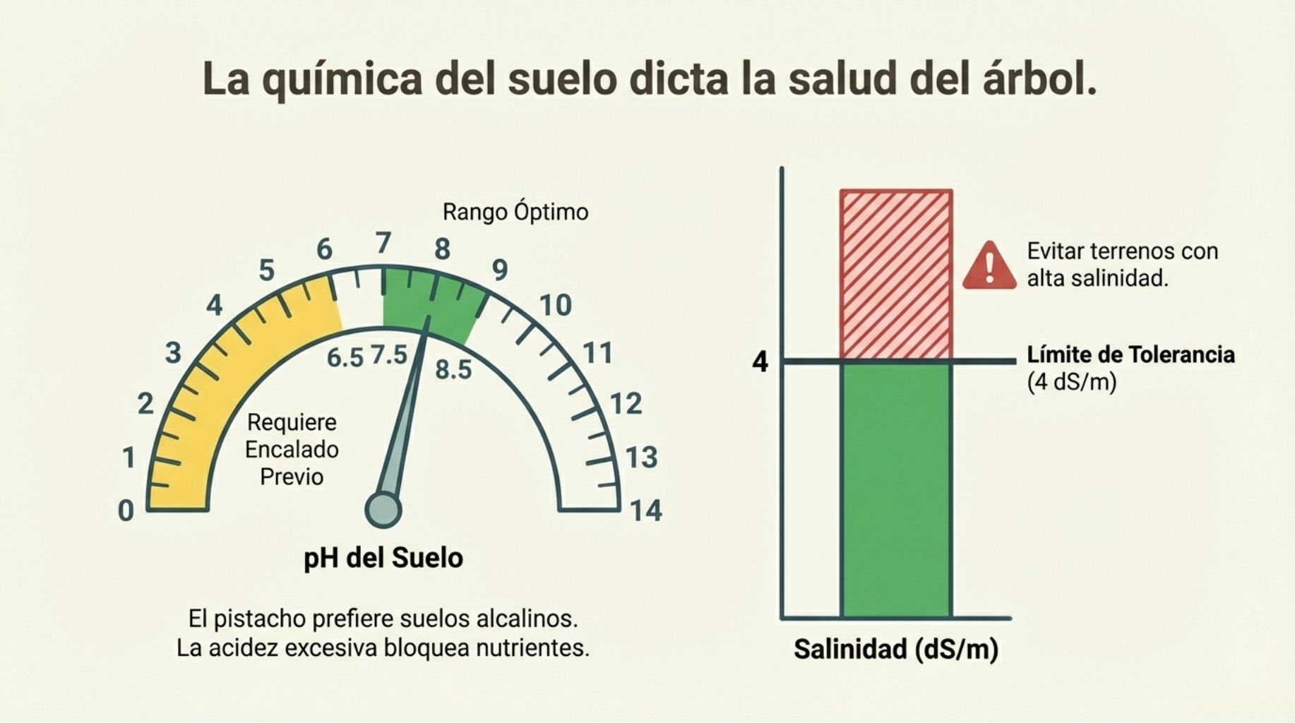 pH: El pistacho prefiere suelos con pH entre 7,5 y 8,5. Suelos muy ácidos (pH < 6,5) requieren encalado previo.