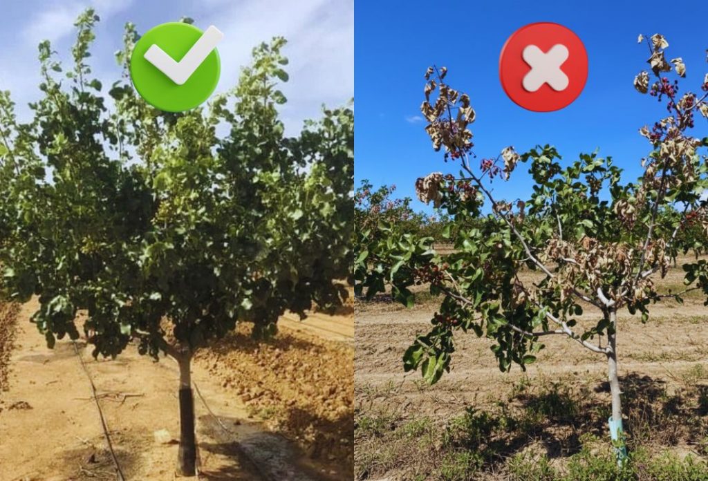 Problema 2: Raíces vulnerables. Las raíces de pistachero franco (sin injertar) son extremadamente vulnerables a plagas y enfermedades. El Verticillium, la Gomosis y otros patógenos pueden destruir árboles enteros.