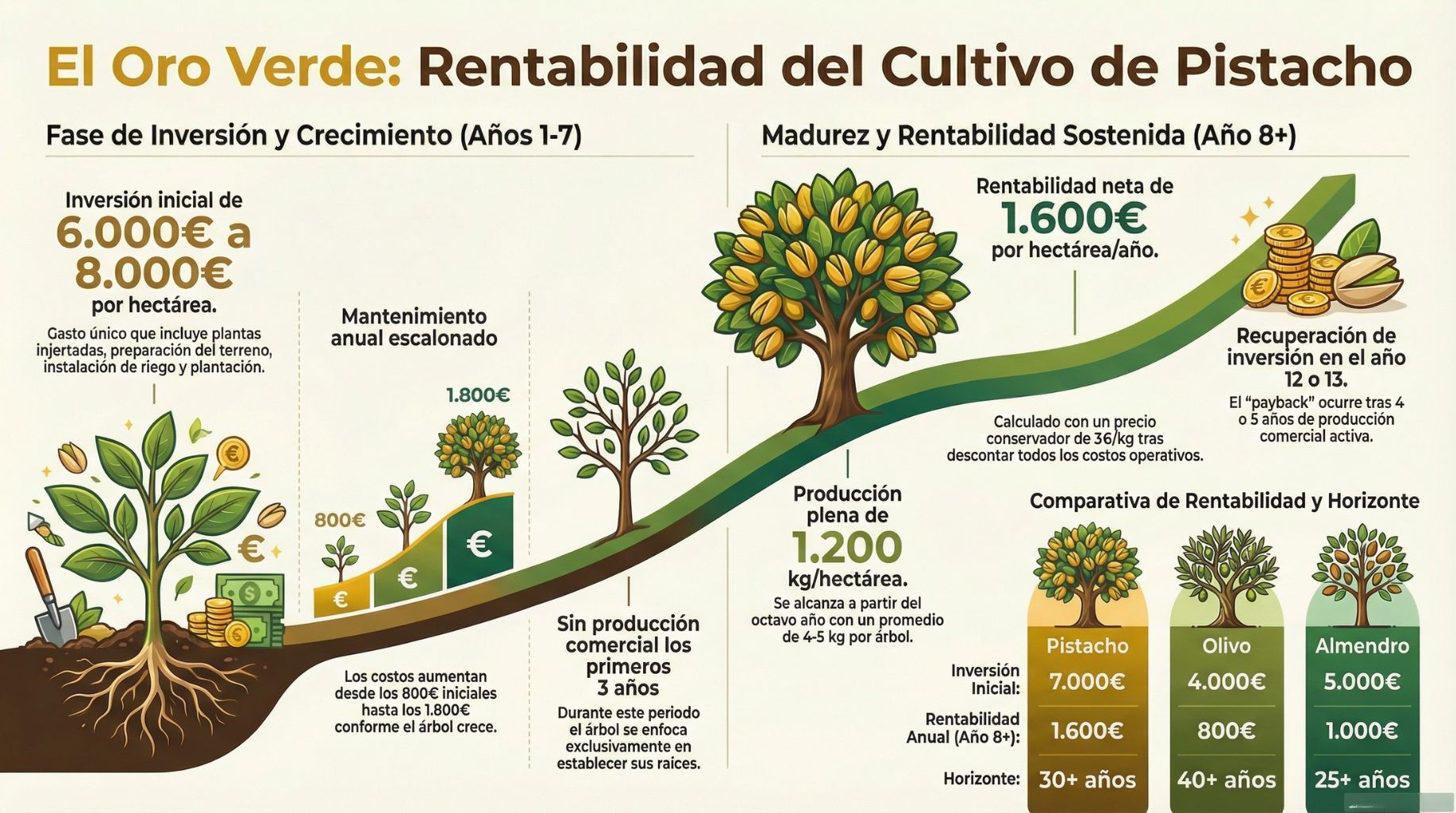 • Años 1-3: 800-1.200€/hectárea/año (laboreo, riego, fertilización básica)