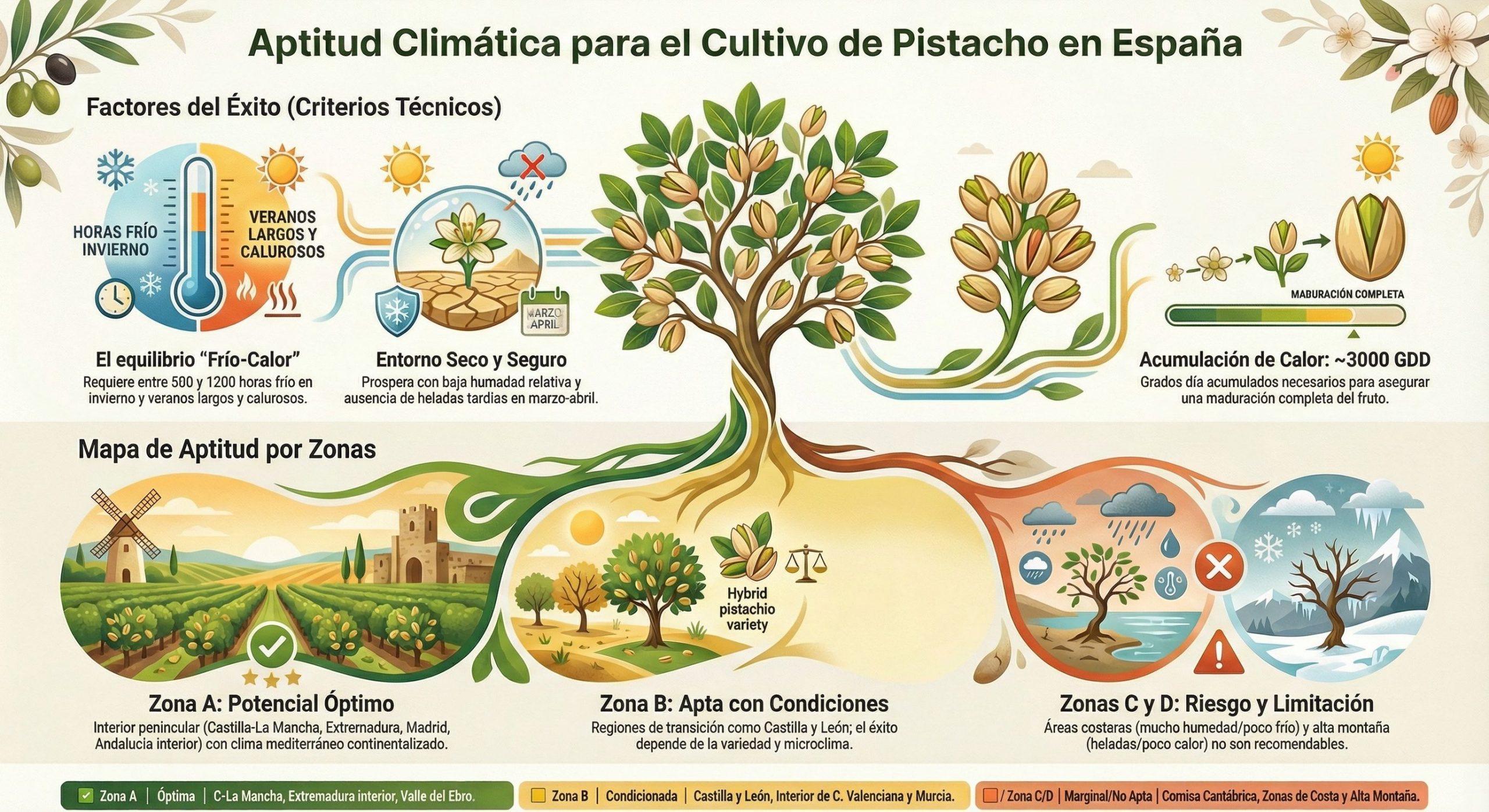 Temperaturas: Veranos calurosos y largos. El pistacho prospera en zonas donde las temperaturas superan regularmente los 35°C en verano. Necesita acumulación de calor para desarrollar frutos de calidad.