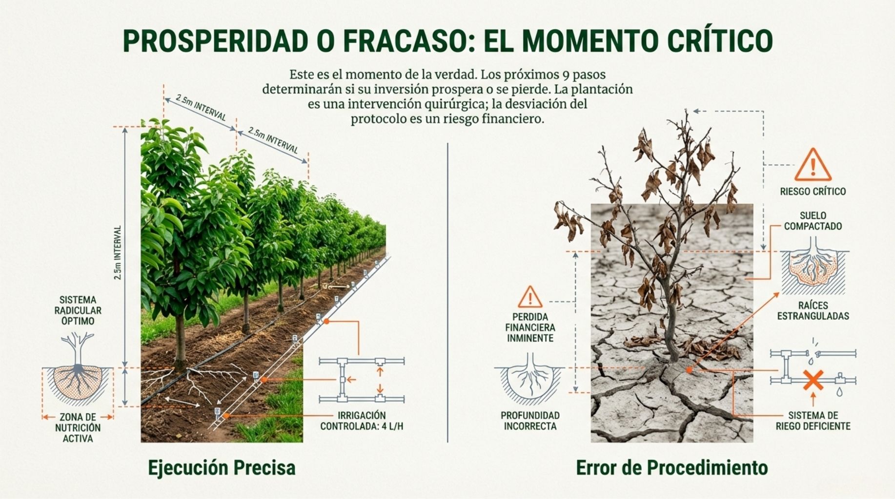 Muchos agricultores cometen errores en las fases iniciales que comprometen la rentabilidad de sus plantaciones durante los próximos 30 años. Desde la elección incorrecta del terreno hasta técnicas de plantación inadecuadas, estos errores son costosos y, en muchos casos, irreversibles.